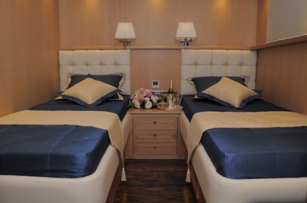 Blue Heaven Gulet is a 30.00 m. meters wooden crewed yacht which launched in 2011. She designed for luxury private crewed yacht charters with modern and large cabins, saloon and deck. 2 master cabin with french bed, 2 twin cabin with 2 single beds is offering spacious accommodation up to 8 people. In each cabin, including seperately placed shower unit, it has its own private shower and toilet. All the yacht, including the cabins are air-conditioned.