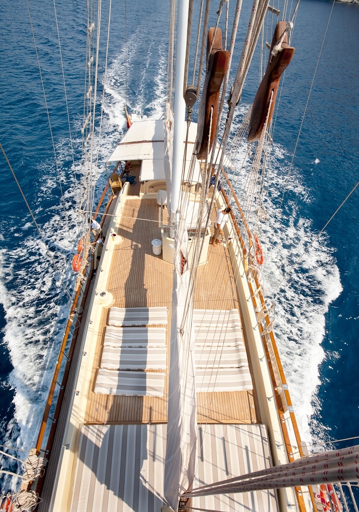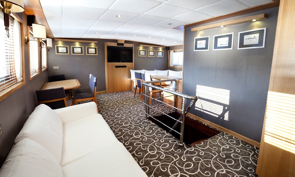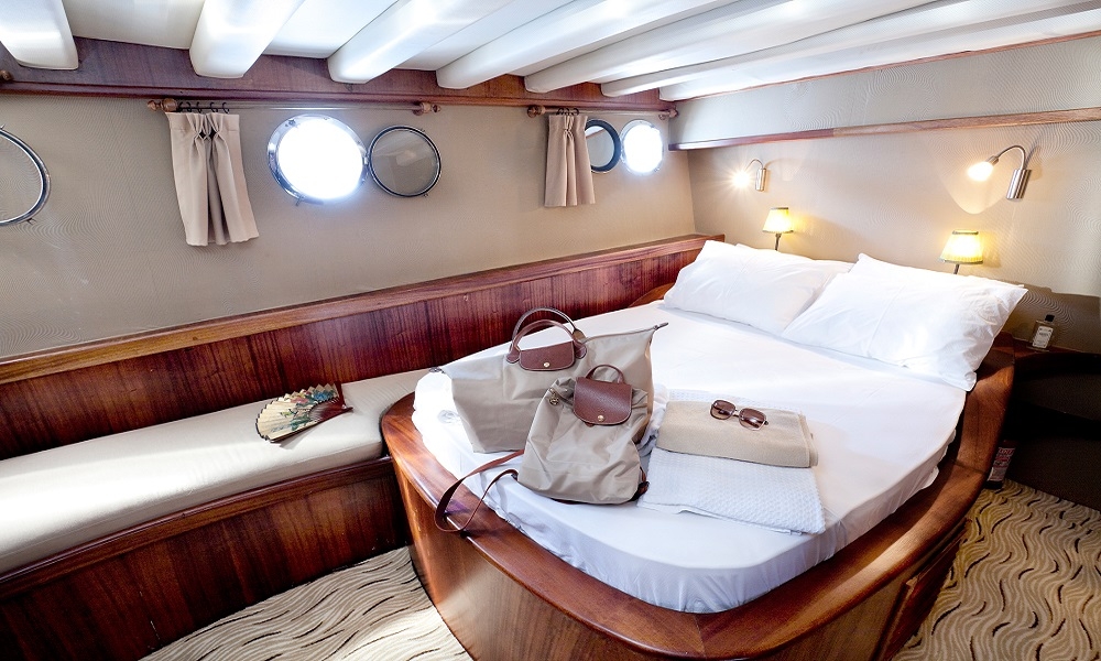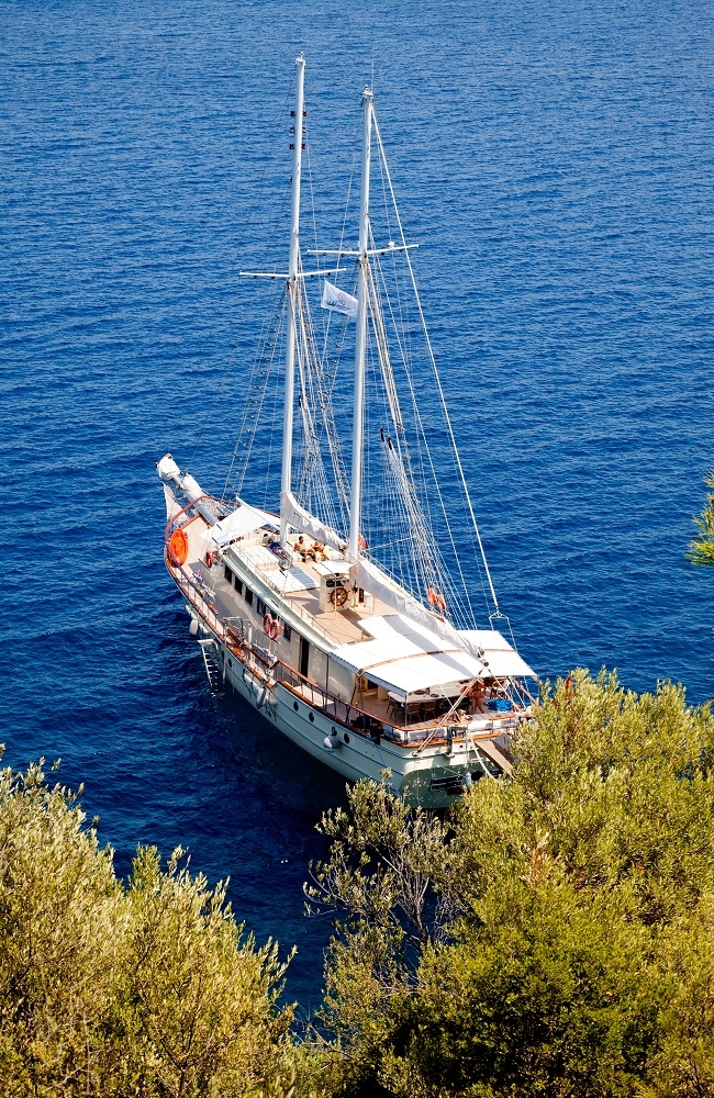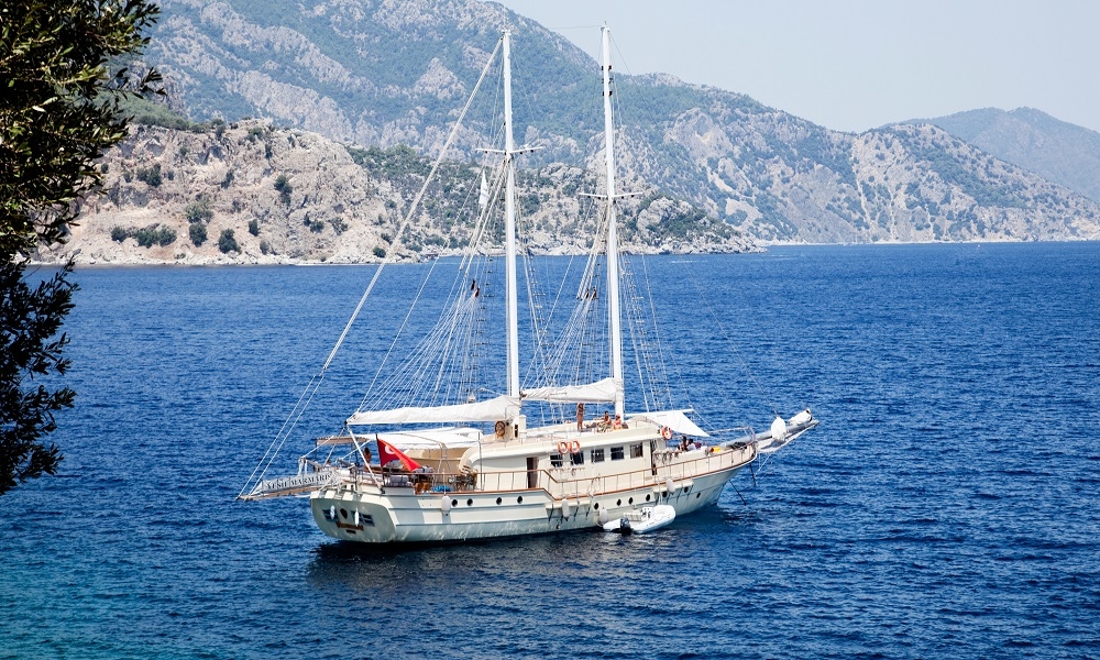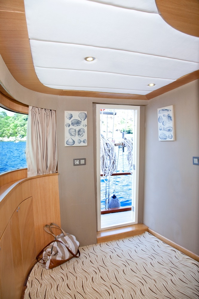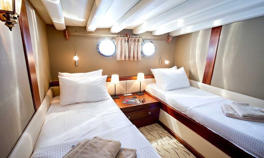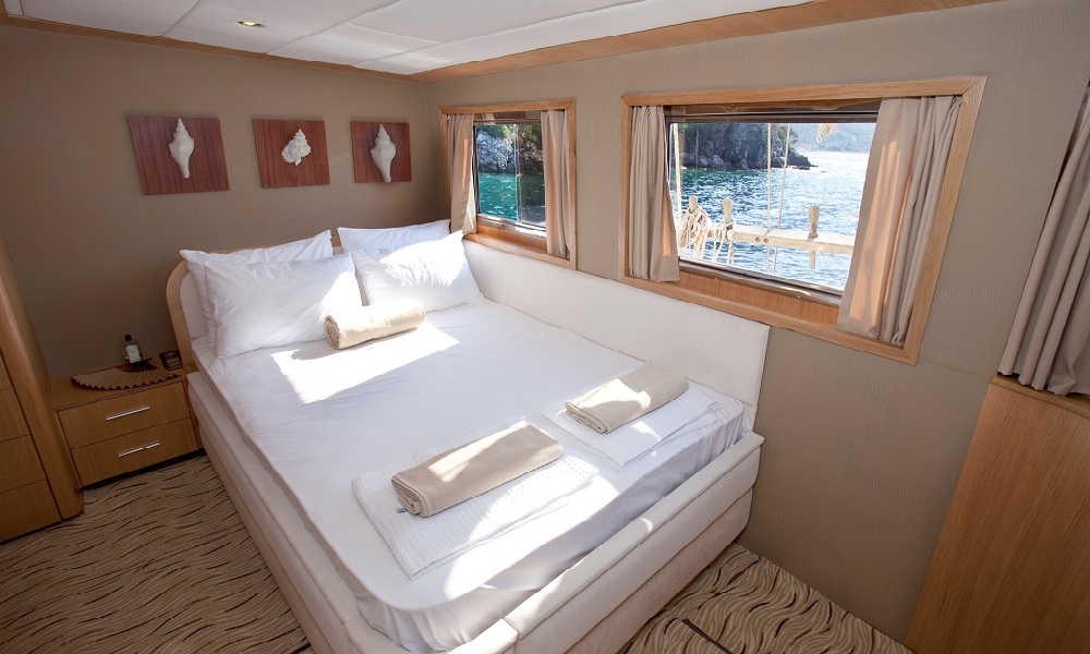 Our gulet was refurbished in year 2011 and has the same luxury of a 5 star hotel. On the upper deck she has 1 master ( 16 m² ), at the lower deck 1 master ( 17.5 m² ), 2 double and 4 twin cabins. Totally she has a capacity to accommodate up to 16 persons. All cabins are first class and are cleaned regularly. She offers you the opportunity to cruise on Turkish and Greek territorial waters. She also provides you an experienced and friendly crew of 4 to accompany you through the whole blue cruise so to leave with unforgettable memories. She is renown for her comfortable spacious living areas, depending on the weather conditions she also is available to sail.