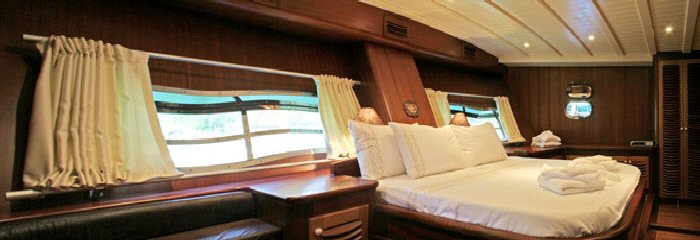 Princess Karia 2 Gulet is a 34.00 m. meters wooden crewed yacht which launched in 2008. She designed for luxury private crewed yacht charters with modern and large cabins, saloon and deck. 2 master cabin with french bed, 2 double cabins, 2 triple cabin with 1 double + 1 single bed is offering spacious accommodation up to 12 people. In each cabin, including seperately placed shower unit, it has its own private shower and toilet. All the yacht, including the cabins are air-conditioned.