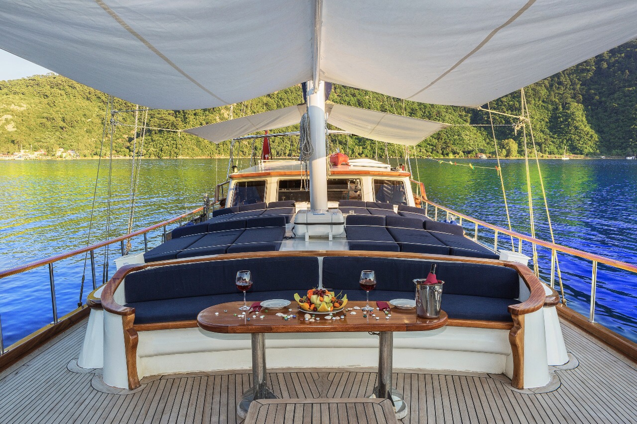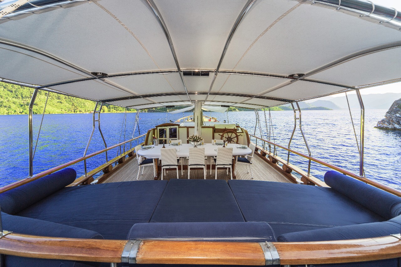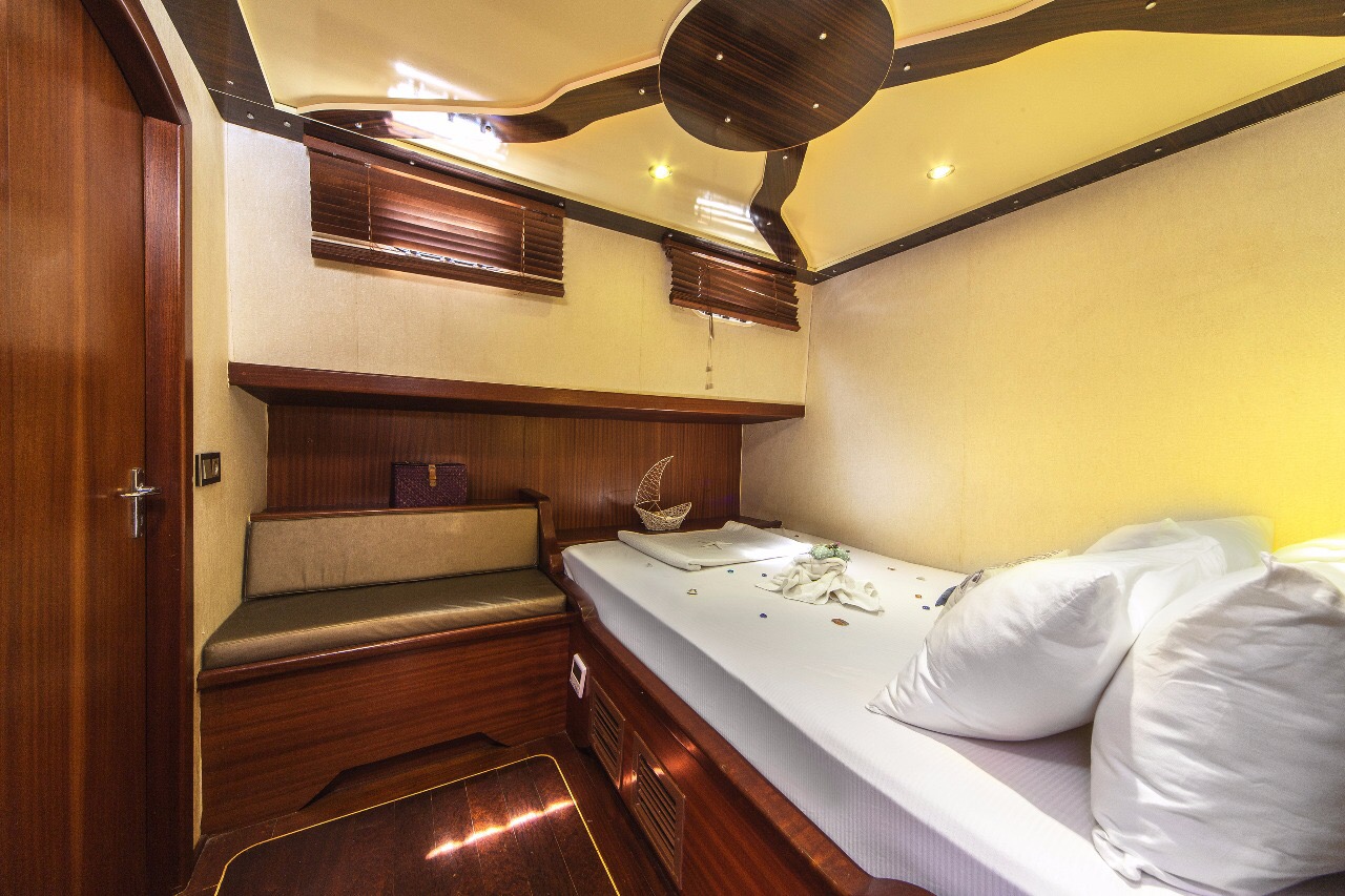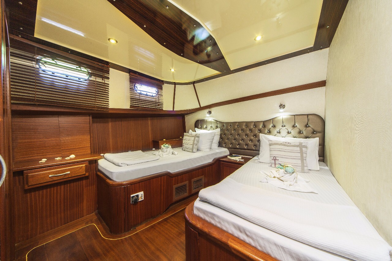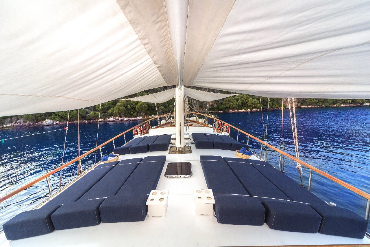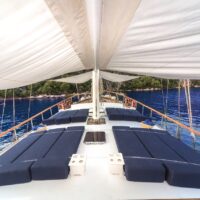 Gulet Remzi Yilmaz, based Marmaris, Turkey, heart of the Blue cruise route and convenient for Rhodes, Greece and the South Dodecanes Isles. Launched in 2012, this 27 metre ketch design yacht has modern and chic interior design. She has 6 cabins that accommodate up to 12 guests, 1 master 4 double and 1 twin, all are air-conditioned and have en-suite bathrooms. She is spacious and comfortable with ample dining and relaxation areas. TV, DVD, music system, internet are some of her many features. There are 4 professional crew to take care of you and a service boat with 40HP outboard, plus a selection of watersports. For groups of up to 12 guests, Remzi Yilmaz is an ideal choice to private charter.
