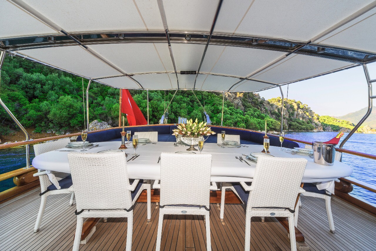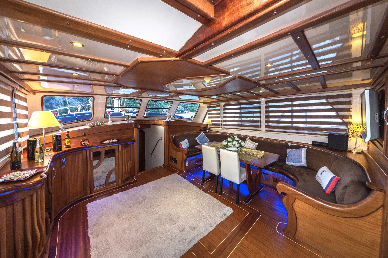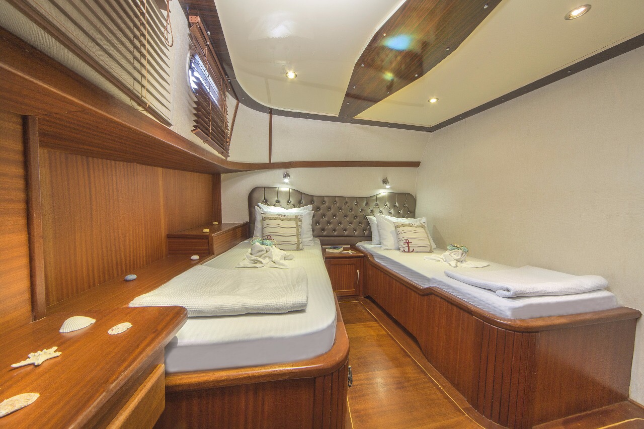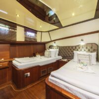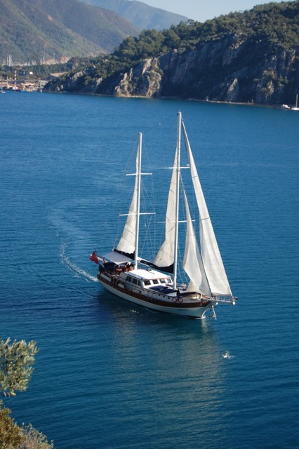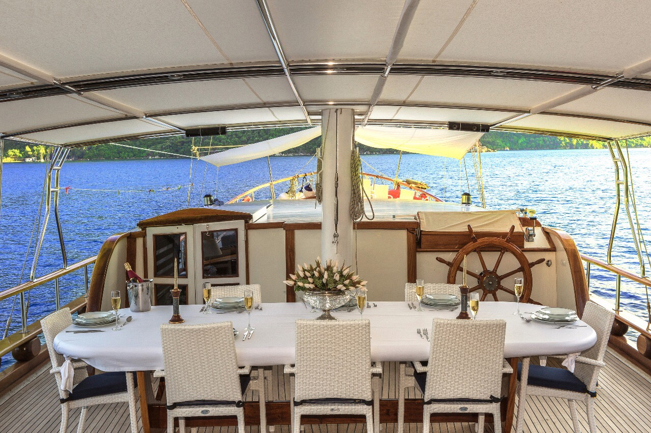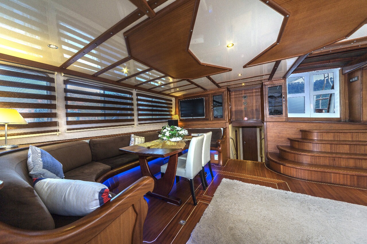 Gulet Remzi Yilmaz, based Marmaris, Turkey, heart of the Blue cruise route and convenient for Rhodes, Greece and the South Dodecanes Isles. Launched in 2012, this 27 metre ketch design yacht has modern and chic interior design. She has 6 cabins that accommodate up to 12 guests, 1 master 4 double and 1 twin, all are air-conditioned and have en-suite bathrooms. She is spacious and comfortable with ample dining and relaxation areas. TV, DVD, music system, internet are some of her many features. There are 4 professional crew to take care of you and a service boat with 40HP outboard, plus a selection of watersports. For groups of up to 12 guests, Remzi Yilmaz is an ideal choice to private charter.