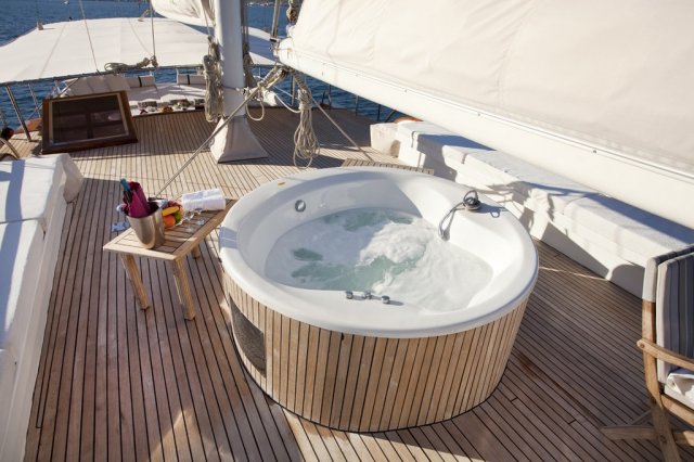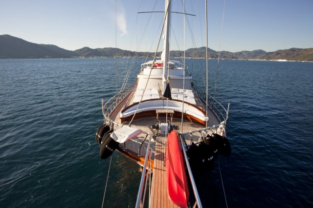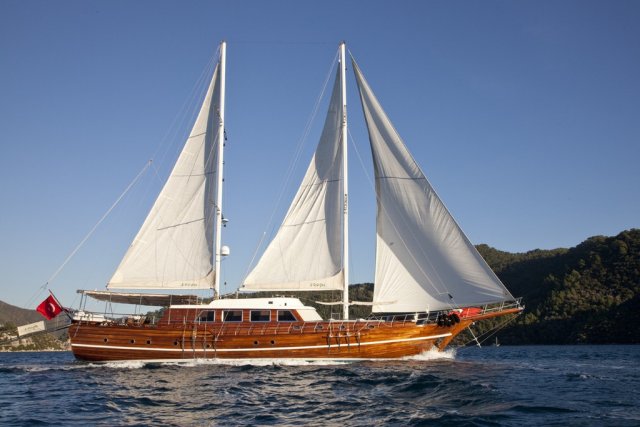 S.Dogu Gulet is a 32.00 m. meters wooden crewed yacht which launched in 2005. She designed for luxury private crewed yacht charters with modern and large cabins, saloon and deck. 2 master cabin with french bed, 4 double cabins is offering spacious accommodation up to 12 people. In each cabin, including seperately placed shower unit, it has its own private shower and toilet. All the yacht, including the cabins are air-conditioned. Gulet S.Dogu‘s interior is decorated tastefully to give a feeling of swimming in luxury. It has a dining table, a fully equipped separate kitchen and an open/closed dining room and an air-conditioned saloon. When you sail or reach the shore, the sun beds spread out on the deck will offer you an excellent opportunity to sunbathe and relax.