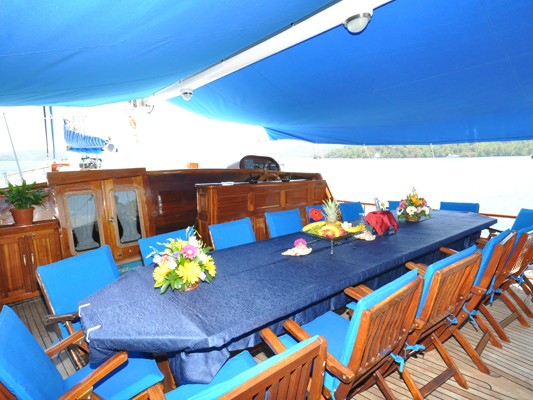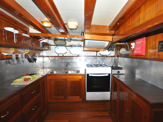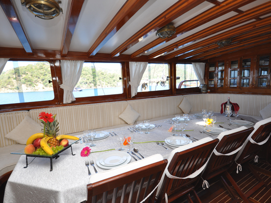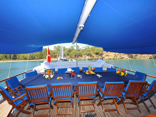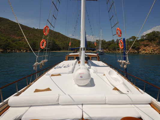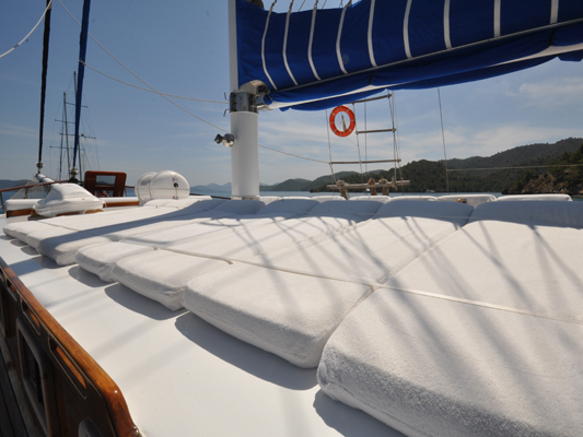 With lazing space in the shade, there are more sunbeds on the fore deck, and a couched seating bench for end of day sunset drinks to take in views of the Turkish and Greek Islands coasts.